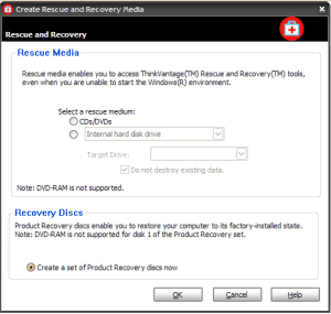 Zde je to trochu komplikovanější, protože na novém disku samozřejmě není přítomna zmiňovaná skrytá partition s instalačními soubory a drivery. Zde je nutné připravit si instalační CD nebo DVD pomocí toolu Create Recovery Media (opět najdete mezi nástroji Thinkvantage):