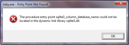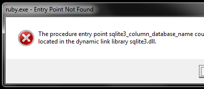 Yesterday I spent couple of hours fighting with Ruby 1.9.2 / Ruby on Rails 3.0 installation on Windows 7 Professional (64 bit). I always hit some kind of problem related to sqlite3 database (that is used by default in Ruby on Rails). There are number of hints, tutorials and forums on this topic on internet, but sometimes misleading. The cause of problem was version of the DLL file.